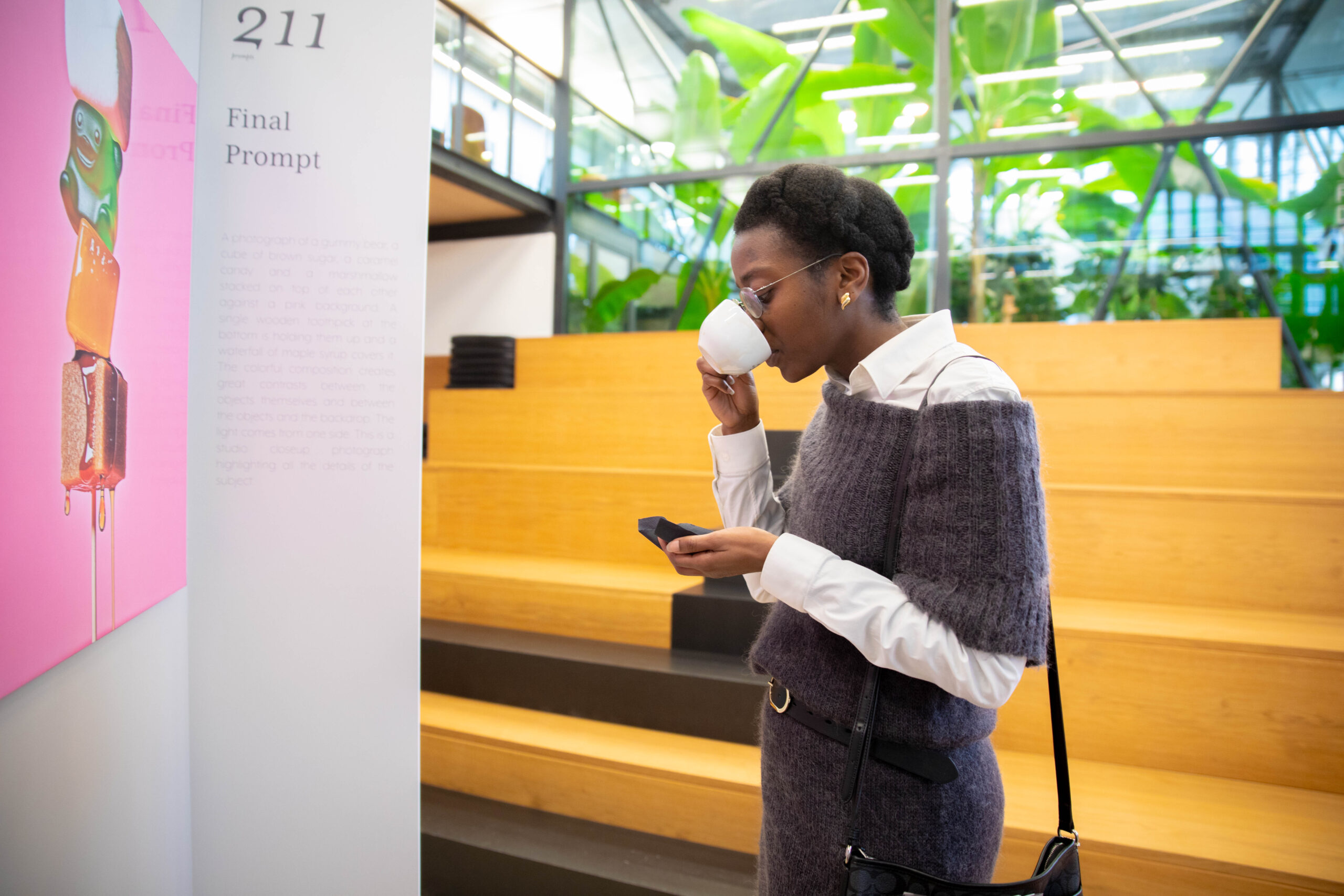 Cuore dell’evento è stata la mostra Facets of Aromas and Flavors, un percorso visivo composto da otto immagini generate con l’intelligenza artificiale, ciascuna dedicata a una delle otto famiglie aromatiche di base del caffè: floreale, fruttato, cioccolato, frutta essiccata, speziato, dolce, frutta secca e fermentato.
