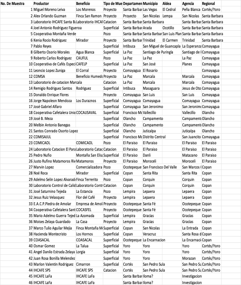 Il programma ha analizzato 46 acque differenti, provenienti da unità di processamento presenti in tutto il Paese, in cooperative o strutture produttive, dove normalmente vengono usate nella trasformazione del caffè lavato (sistema più utilizzato per il processamento delle ciliegie in Honduras), per condizionare il caffè prima dell’essiccamento, e molto spesso per le attività di cupping. Le Regioni coinvolte sono state: Santa Barbara (8), Intibuca (2), La Paz (5), Comayagua(3), Francisco Morazan (2), Olancho (3), El Paraiso (4), Ocotepeque (5), Copan (5), Lempira (4), Yoro (3), Cortes (2) (vedi mappa relativa).