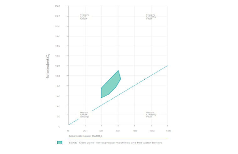 - L’Alcalinità Totale:“L’alcalinità è una misura della concentrazione dell’anione bicarbonato nell’acqua. I carbonati hanno il potere di attrarre e legare a sé gli ioni di idrogeno (H +) e come conseguenza abbassano l’acidità dell’acqua. L’alcalinità influenza la tamponazione degli acidi del caffè, quindi come conseguenza se c’è troppa alcalinità non verrà percepita acidità nel caffè.”